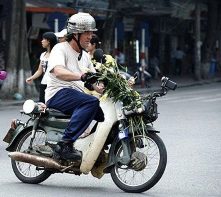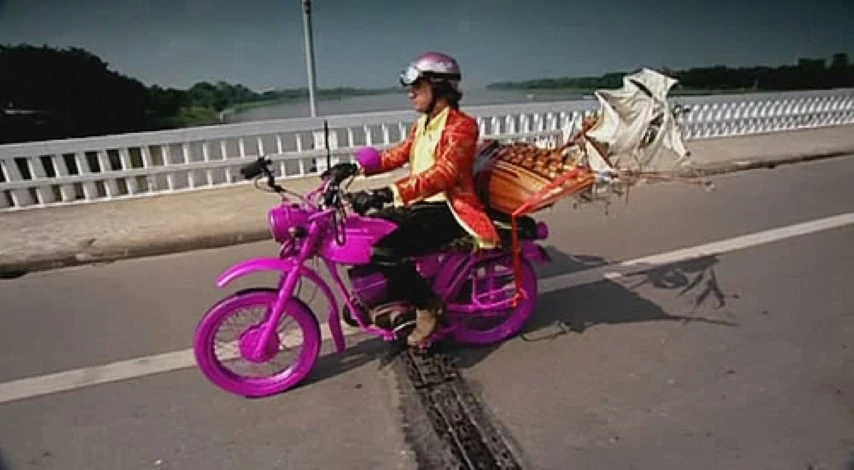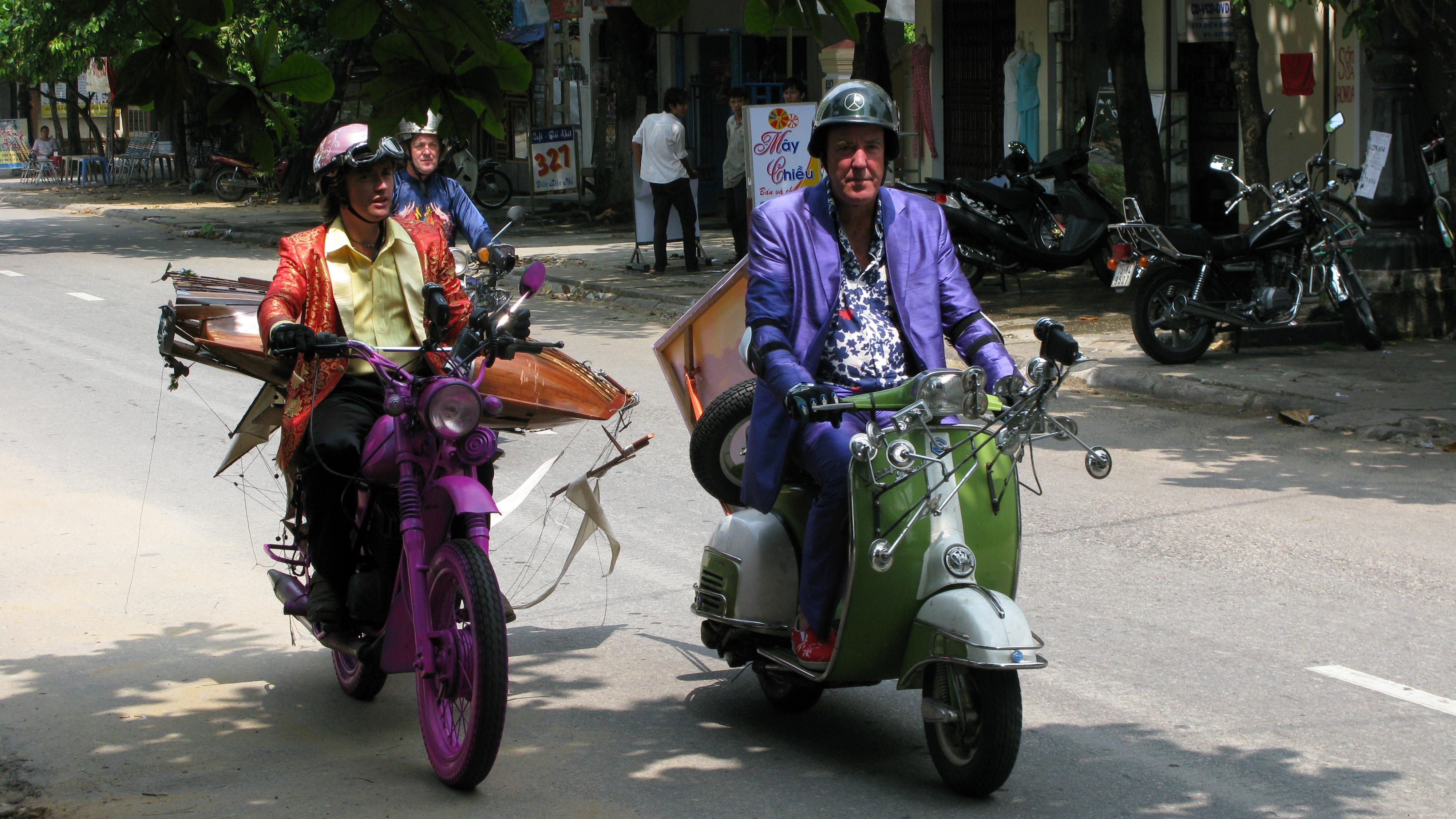 At the restaurant, Jeremy knowingly knew Richard hasn't had much to eat except Rice Krispies, so he ordered set menu B which was various dishes that had snake in them. After drinking too much snake vodka, James and Jeremy took Richard's helmet and destroyed it by having a lorry run over it and brought him a new one, a pink helmet. Along the way in the rain, Jeremy curses his life and James mockingly sings Beach Boys’ 'Little Honda', but soon ran out of fuel and Richard's clutch cable snapped. James is soon provided gas by a polite man and after meeting up with the others, they were told by the frustrated producers that they can't just fix their bikes, they soon provided a back-up bike, a Honda Chaly mini-bike, painted and flanked in a livery (similar to the bike seen in the film Easy Rider and fitted with an iPod audio system continuously playing "Born in the U.S.A." ("The Star-Spangled Banner" in the iTunes, Netflix, and Tubi releases, however references to Springsteen and the song remain in these versions.) Eventually, they manage to get their bikes working and drive all the way to Nha Trang, but along the way, Jeremy's headlight died and he taped a torch before they head into town where Jeremy buys a Galleon for Richard as part of a challenge to keep it secure on his bike since they didn't have cars. They rode along the roads for a day and a half, and went to Hoi An to buy new clothes as theirs got filthy. Since the clothes would take a whole day, they chose to go to the beach, but Jeremy gives up for some peace and Richard mistakenly rode his bike near the waves, damaging it, and the backup bike mocks him. As his bike was being mended, Richard was lectured by a deaf and mute army veteran about how he fought in the war while James and Jeremy watched an event in town. After getting their new clothes and Richard's bike having been mended, they took off and Jeremy asks who wrote 'Penis' on his helmet, which Richard replied that he did. Since James was too far back, the other two decided to buy him a statue which they christen as 'Darcey Bussell'. Along the way, Richard knocks some bins and a toll booth sign over with his galleon, ruining it. Atop a hill, to celebrate Jeremy's debut on a bike, Richard and James give him a painting. Later at the hotel, while Richard fixed the galleon as best he can, only to have a celling fan ruin it again while James and Jeremy persuade a few locals to spray paint Richard's Minsk pink as punishment for breaking the galleon in the first place, resulting in a local girl beginning to spray paint other bikes pink.